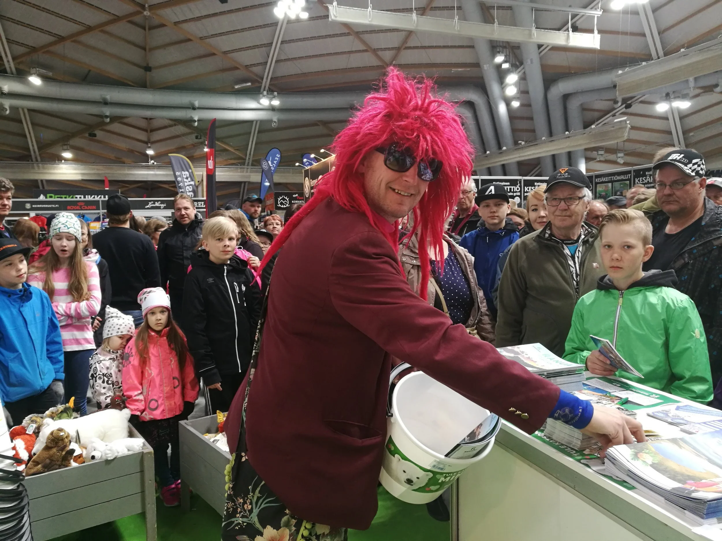 Sankot aiheuttivat yleisöryntäyksen myös Oulun erämessuilla. Vihreässä paidassa Ranuan Seudun Matkailu Oy:n entinen toimitusjohtaja Tommi Hinno.