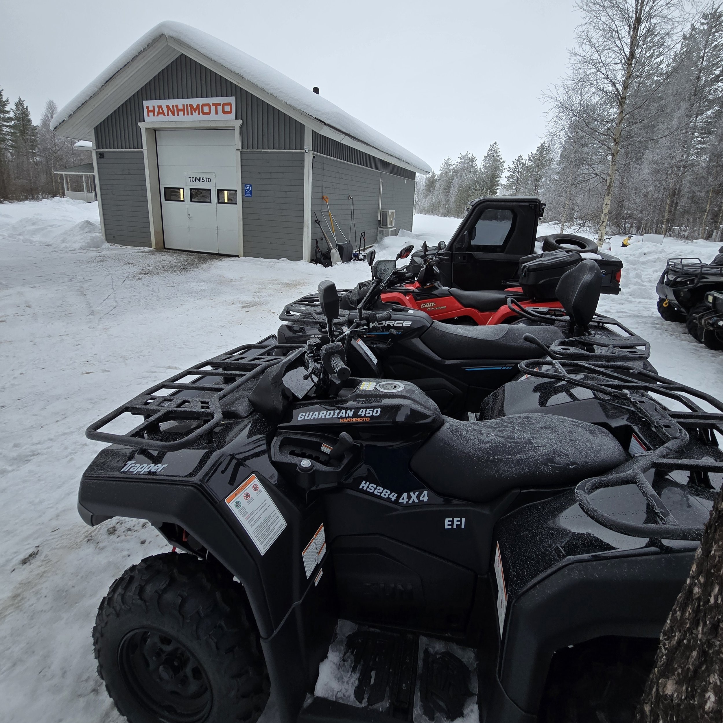Hanhimoton toimisto on Hanhisuannon pihalla olevassa hallissa. Pihalla on myytäviä ajoneuvoja, jotka toimitetaan eri puolille Suomea.