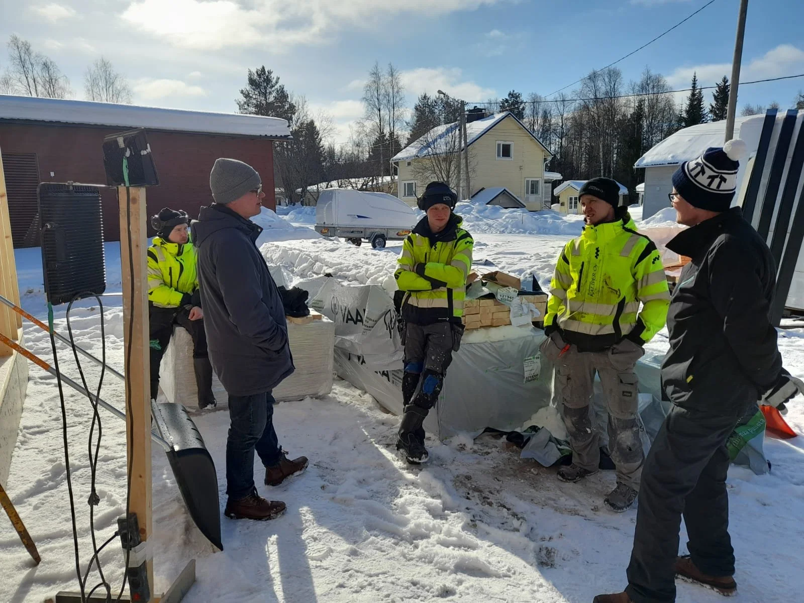 Kunnanjohtaja Tuomas Aikkila ja Business Ranuan tiimi kävivät yritysvierailulla Rakennus Kaliperin työmaalla 17. maaliskuuta. Keltaisissa takeissa vasemmalta oikealla: Jonne Kaikkonen, Aleksi Kaikkonen ja Janne Petäjäjärvi.Veken entiseen kauppaan asuntoja