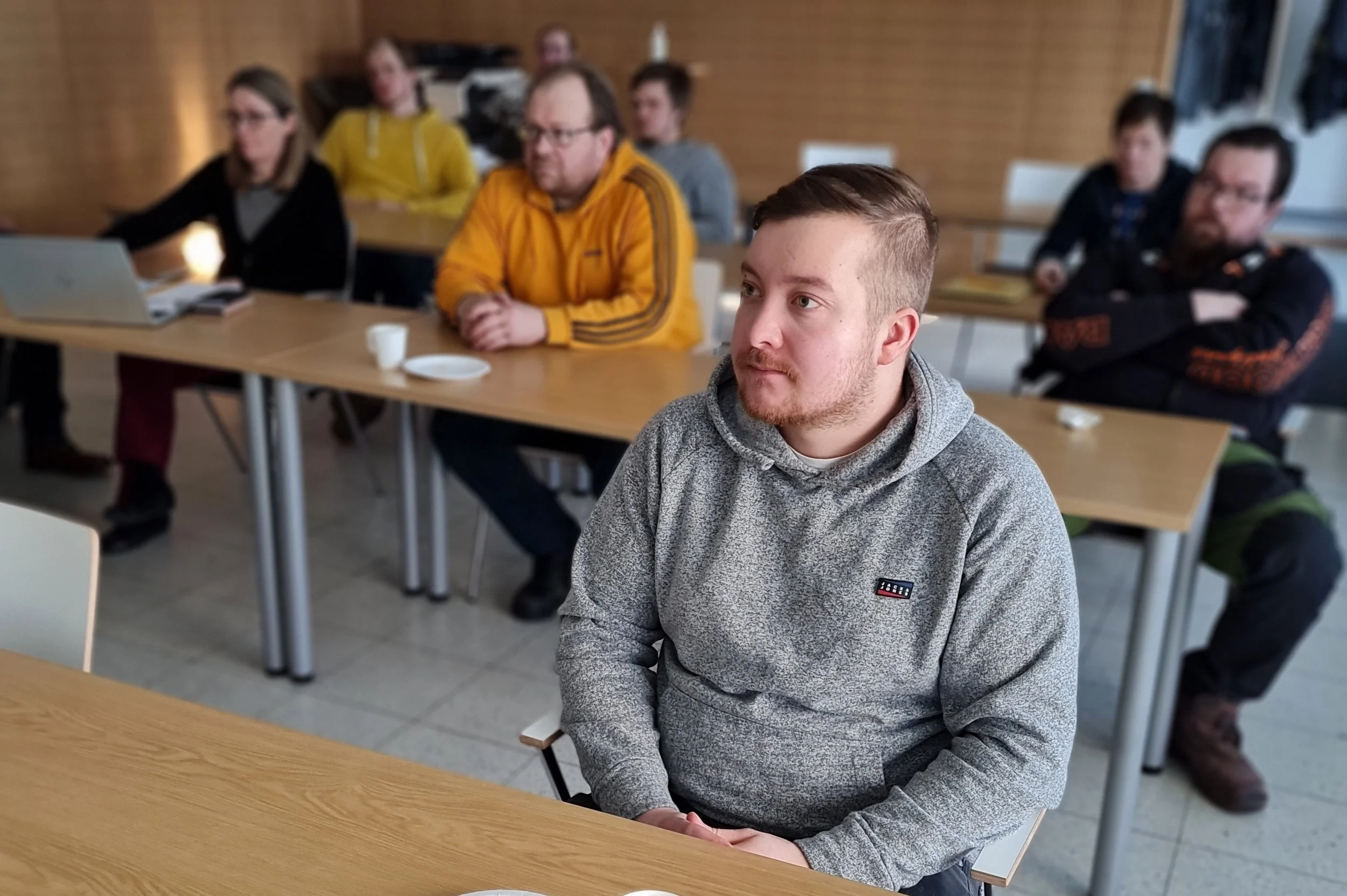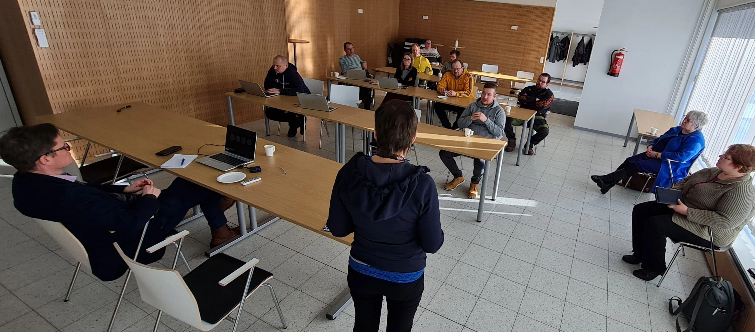 Tilaisuudessa oli toistakymmentä osallistujaa paikan päällä. Keskellä selin maaseutuasiamies Tarja Väärälä.