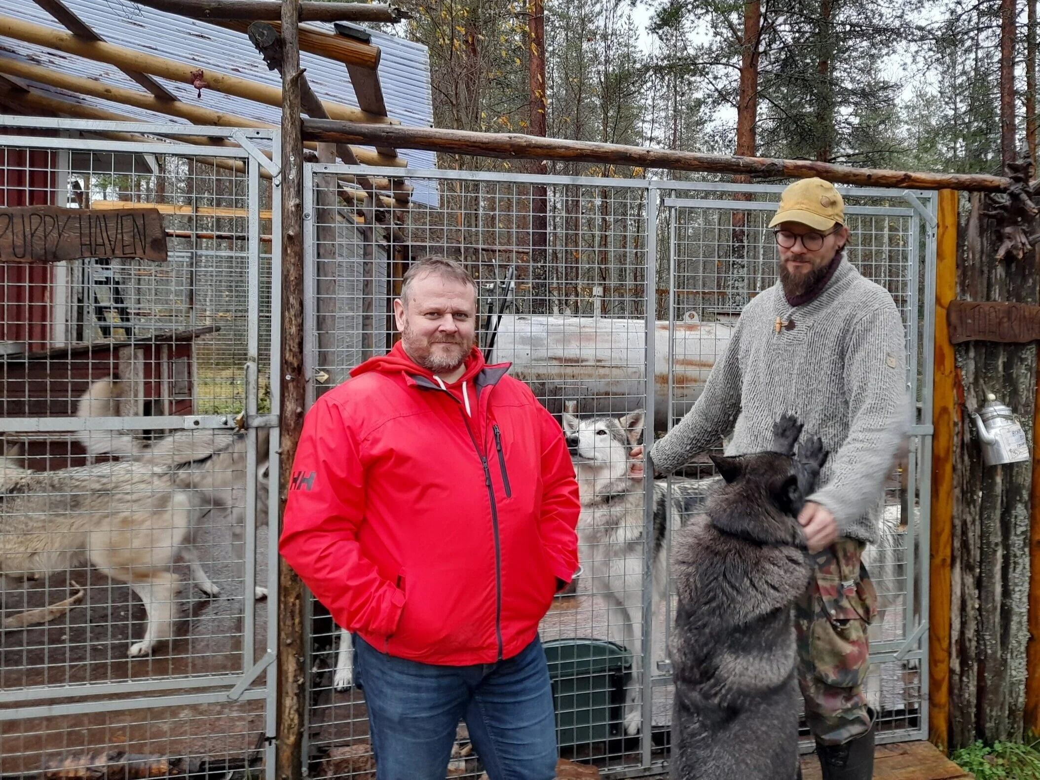 Yrittäjä Valio Susisydän (oikealla) rapsuttaa koirasusia. Vieressä valmentaja Jari Kunnari.